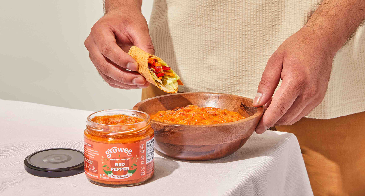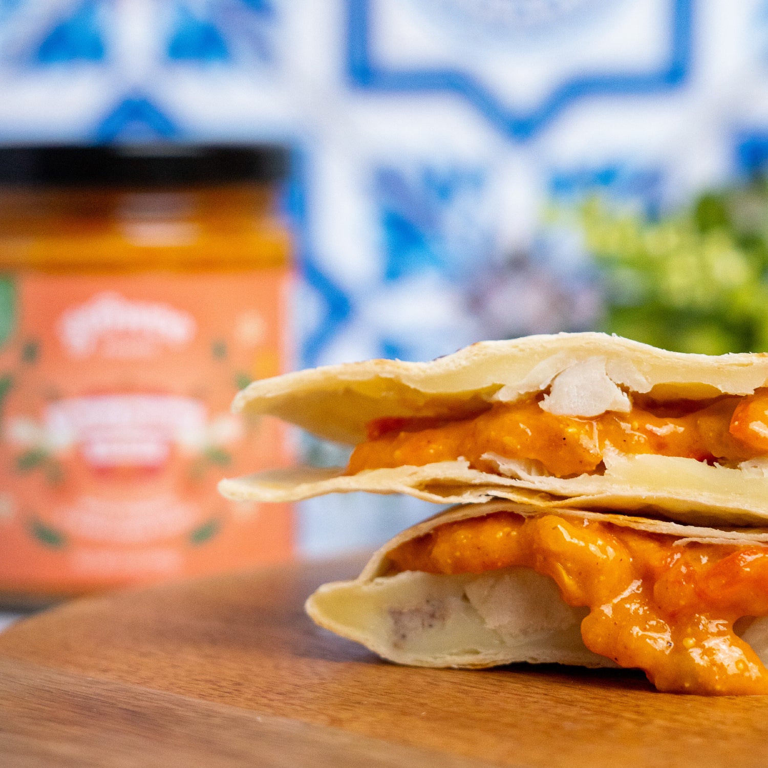 On a corn tortilla, spoon out 2 tablespoons (or more) of our Three Pepper spread and spread evenly. Add plant based cheese (we like the one from good planet foods), add Tofu(replace with any other protein you like), crushed red pepper flakes, salt and pepper. Fold the tortilla in half and place on a lightly oiled skillet or in a Griddler until golden brown and slightly crispy. Slice it into bite size pieces and enjoy your three pepper quesadilla. Our Three pepper spread contains 70% whole veggies so you get your daily veggie portion as a bonus.