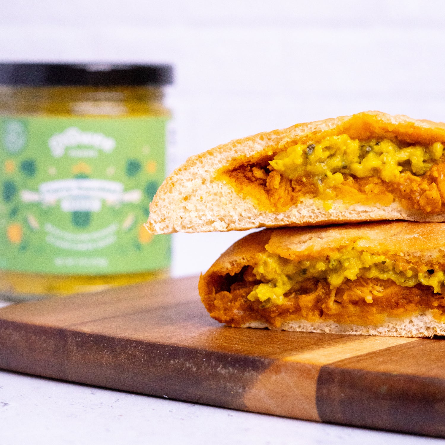 Slice in half and toast your dinner rolls on a pre heated skillet with some butter, each side for up to a minute until the butter is absorbed and the rolls are soft. Add the chick’n patties(we like the spicy plant based patties from Alpha Foods) in the same skillet with additional butter and cook times as per the package description. Once the patties are thoroughly cooked. Brush inner side of your rolls with generous amount of our Spiced Mango spread. Stack it with the patty and other half of the roll. Voila!