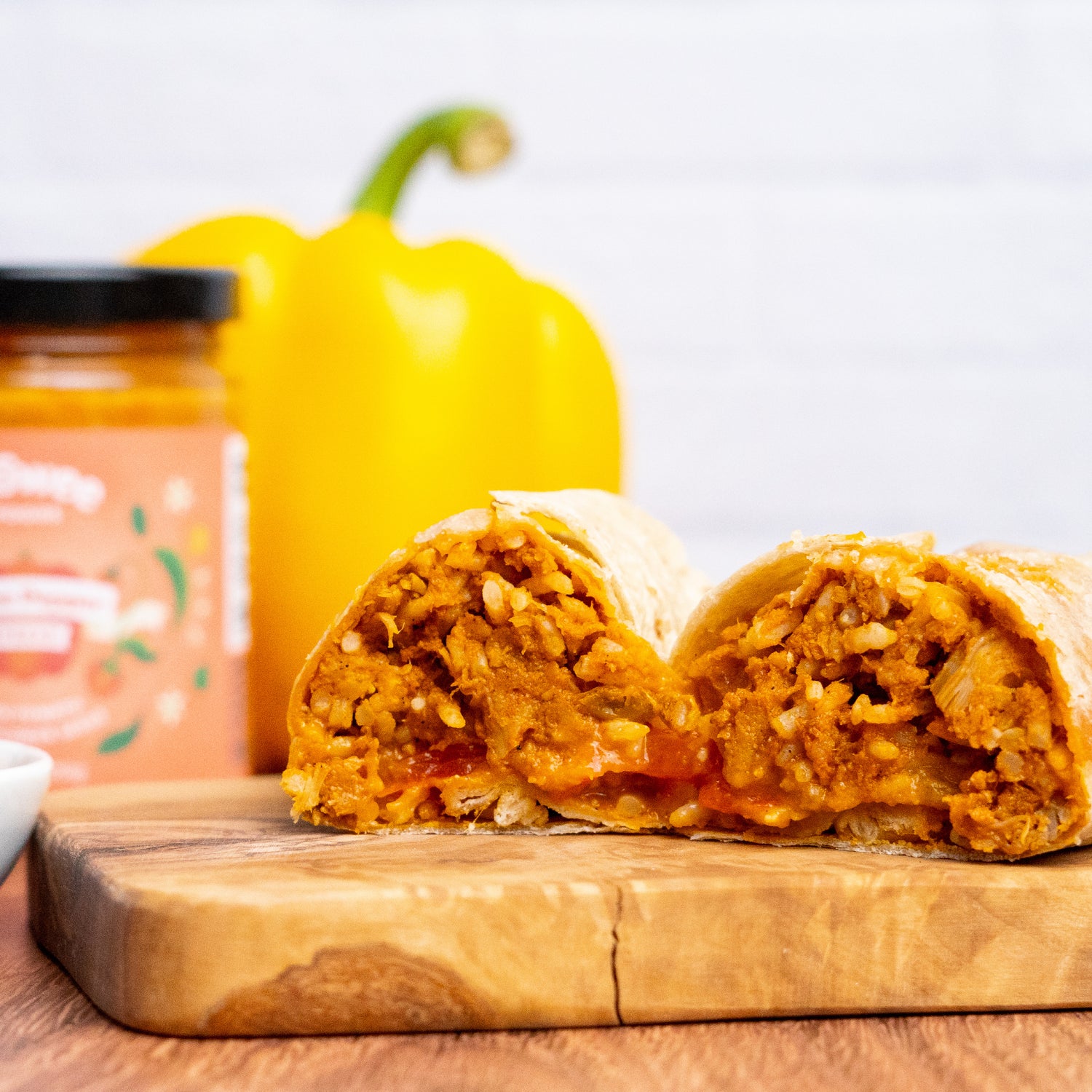 In a large bowl, soak soy curls for 10-15 minutes. Once done, squeeze access water and place the curls a heated pan and stir frequently until golden brown. Set aside the curls and add some olive oil, onions, refried beans, and sauté until slightly charred. Add back the soy curls, salt, pepper, cumin, cilantro and squeeze fresh lemon juice and turn of the heat. On a wheat tortilla, spread generous amounts of the Three pepper spread, and add the soy curl mix and roll up to make a burrito.