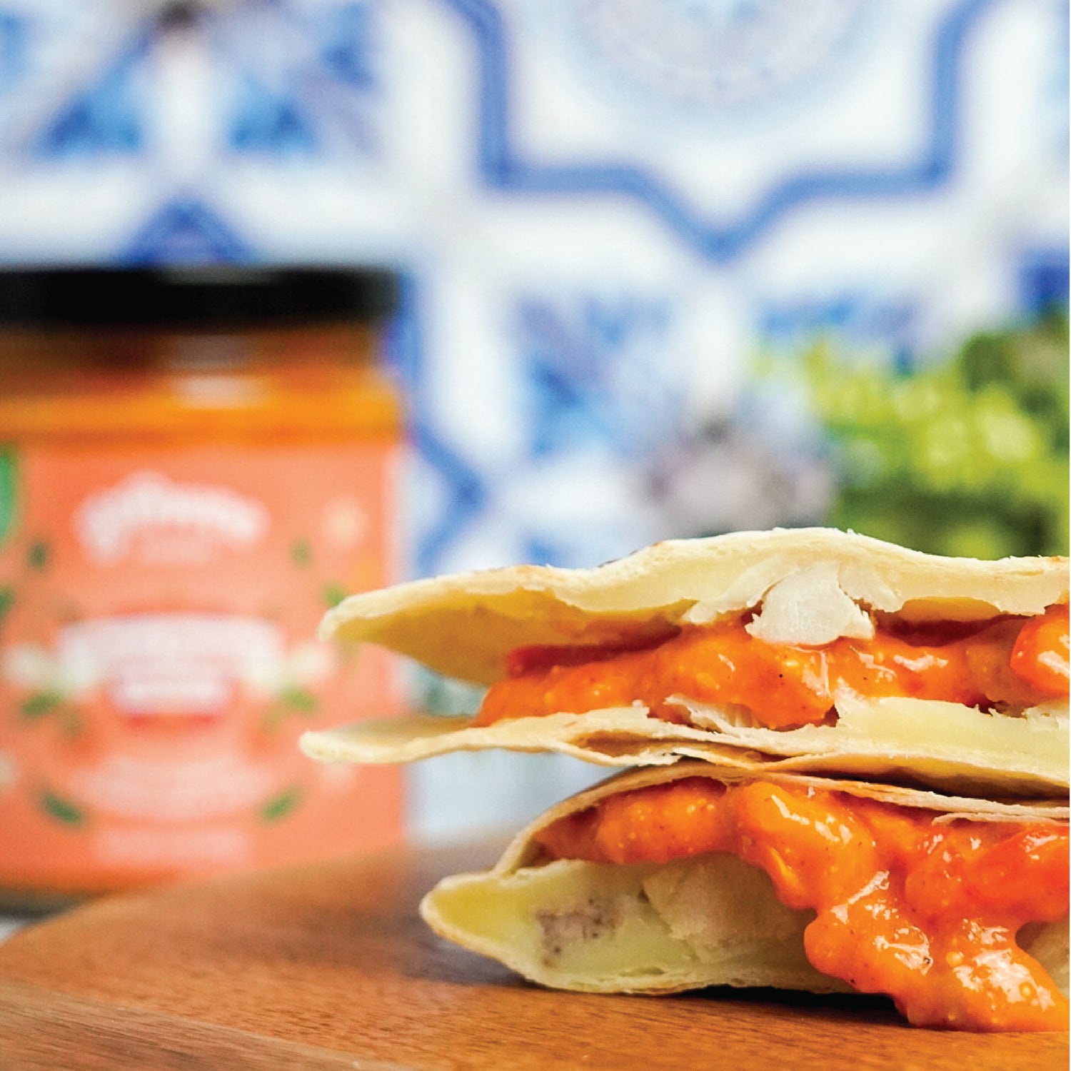 On a corn tortilla, spoon out 2 tablespoons (or more) of our Three Pepper spread and spread evenly. Add plant based cheese (we like the one from good planet foods), add Tofu(replace with any other protein you like), crushed red pepper flakes, salt and pepper. Fold the tortilla in half and place on a lightly oiled skillet or in a Griddler until golden brown and slightly crispy. Slice it into bite size pieces and enjoy your three pepper quesadilla. Our Three pepper spread contains 70% whole veggies so you get your daily veggie portion as a bonus.